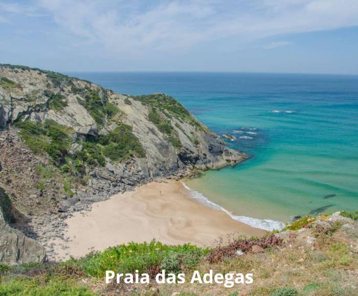 Muitas vezes ofuscada pela imensidão da sua vizinha, a Praia das Adegas é uma enseada confidencial que se conquista. Aninhada vertiginosamente no fundo de uma alta falésia de xisto, logo a sul da praia de Odeceixe, oferece uma intimidade rara nesta costa selvagem. Acede-se por uma escadaria de madeira que serpenteia ao longo da parede, ou contornando os rochedos na maré baixa, dando imediatamente a sensação de entrar num santuário isolado do mundo.